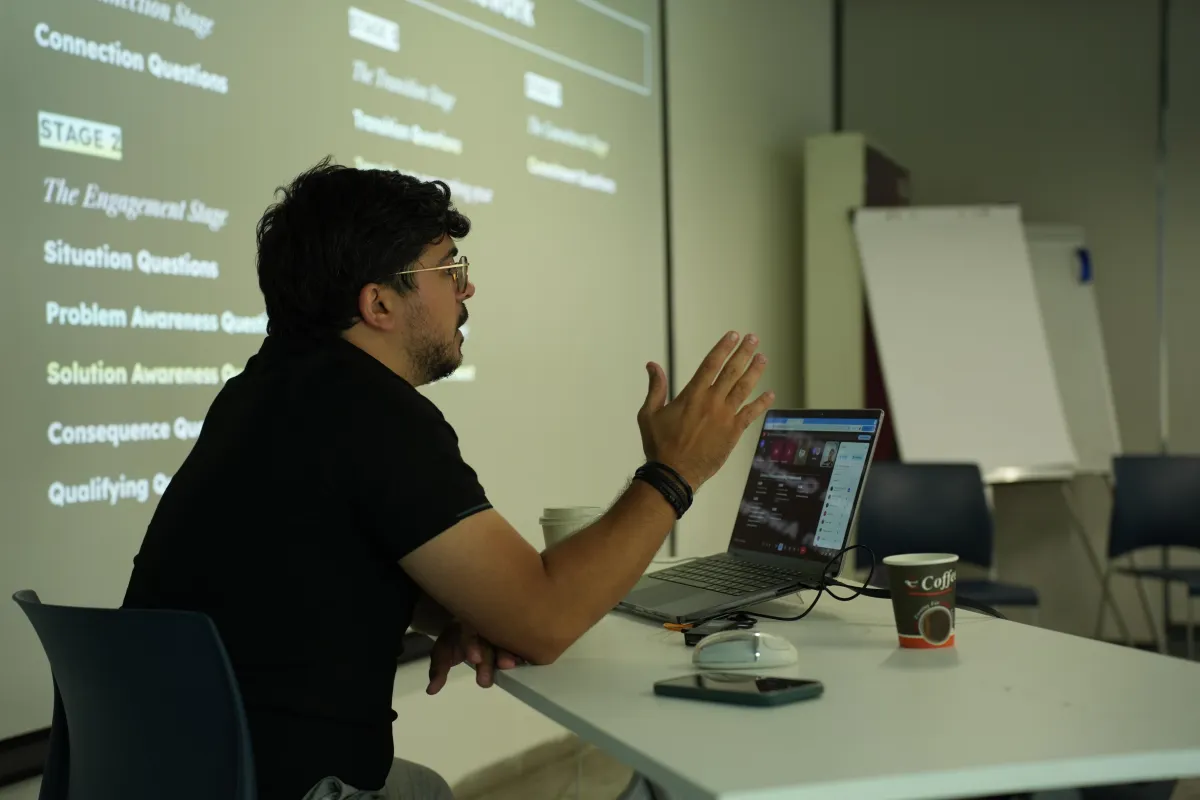 أبدًا. الورشة مصمّمة لتعلّمك كيف تبني عرض يبيع نفسه، مش كيف تكون مندوب مبيعات. راح تتعلم الأسلوب البسيط اللي يخليك تسكر الصفقات بثقة بدون ضغط أو إقناع.